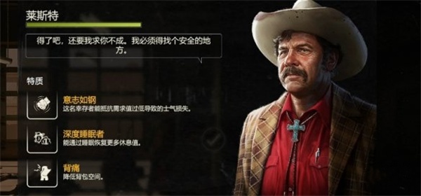 意志如钢:这名幸存者能抵抗需求值过低导致的士气损失。