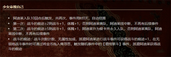 4、第二次审视如果战斗的痕迹≥5则战斗+1,体魄+1,阿迪莱升为银卡并永久入队,否则阿迪莱离队,阿迪莱线中断,不再有后续事件。