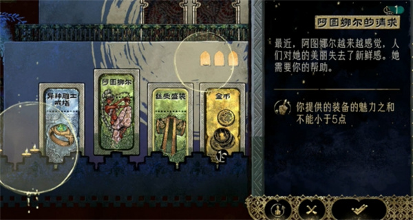 1、阿图娜尔的请求需要我们提供一个蓝装和一颗绿装将魅力提升到5。