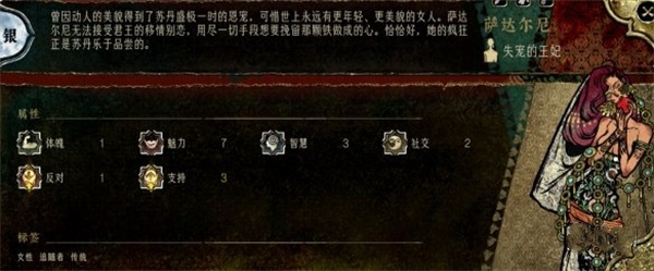 在卡牌策略角色扮演游戏苏丹的游戏中,每个NPC都有对应的人物事件,具有时限、耗时、判定属性、消卡等区别,部分玩家不知道失宠的王妃萨达尔尼有什么事件,下面就为大家带来苏丹的游戏中萨达尔尼人物事件的介绍说明,有需要的玩家可以参考。