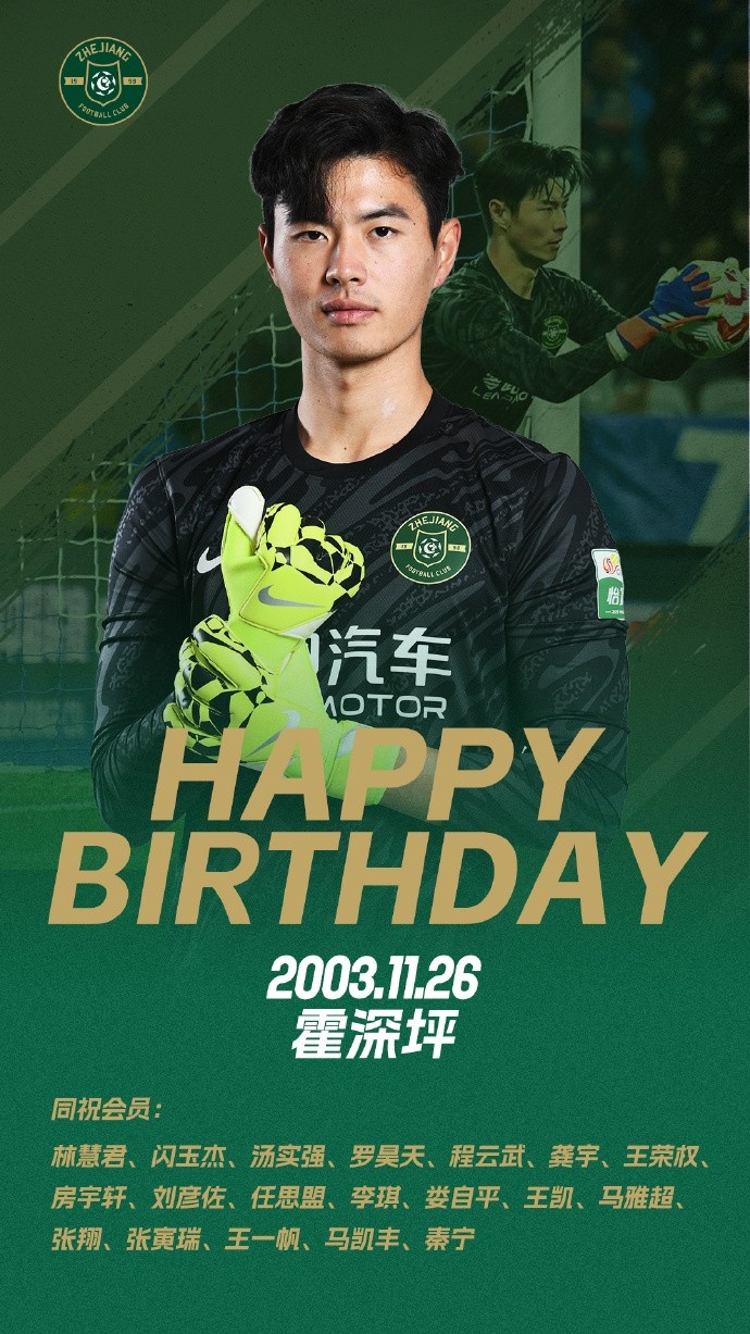 直播吧11月26日讯 中超浙江队官方发文,为门将霍深坪庆祝22岁生日。