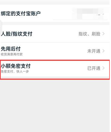 4. 进入支付设置页面后,点击【小额免密支付】功能项,这里显示当前开通状态。