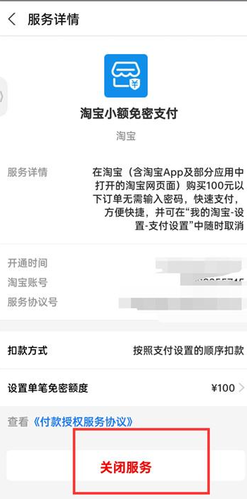 5. 最后在小额免密支付管理页面,点击【关闭服务】按钮确认关闭,系统会提示关闭成功。