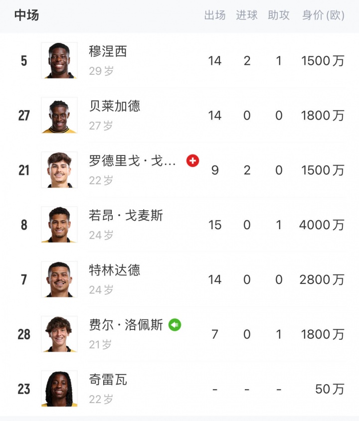 狼队中场7人中,6人身价均超1000万欧,仅来自津巴布韦的奇雷瓦身价50万欧,但他本赛季还未代表一线队出场过,主要在U21联赛踢球。狼队中场球员中身价最高的为来自巴西的戈麦斯,身价4000万欧,本赛季15场0球1助。