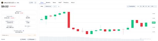 截至2025年7月,LEO价格稳定在9.02美元,市值达83.4亿美元,位列全球加密货币第20位。相比历史低点0.8036美元,累计涨幅达1024.68%。当前日交易量79.2万美元显示市场活跃度适中,而比特币主导的加密市场总市值维持3.33万亿美元规模。
