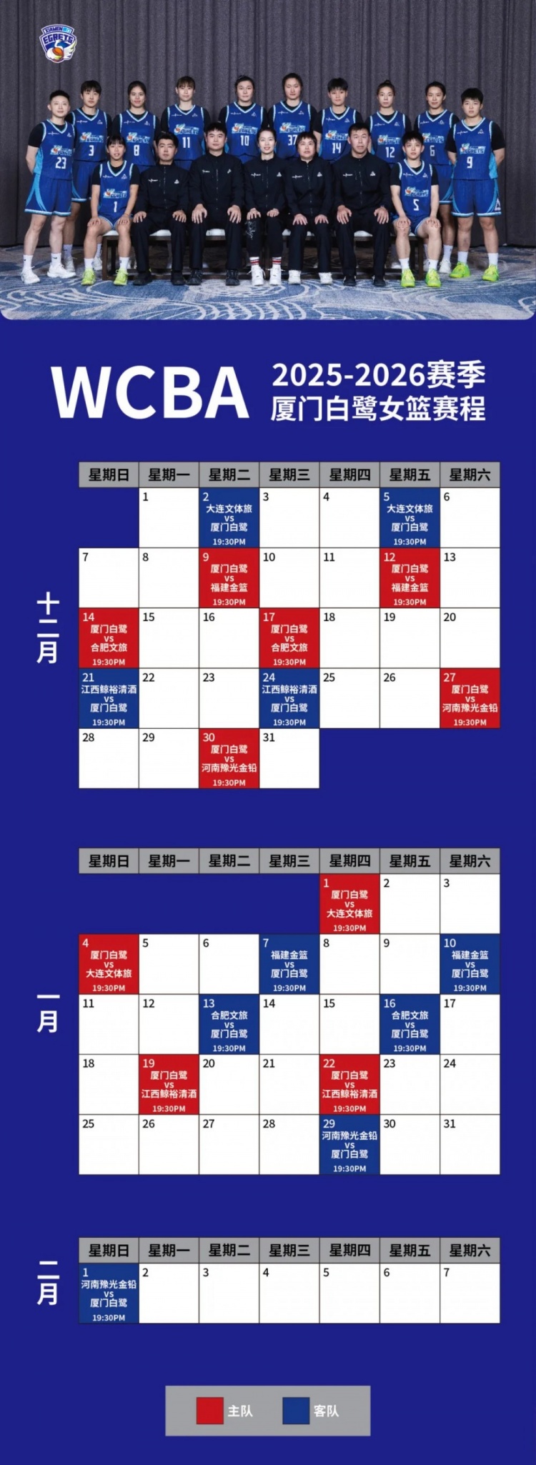 福建厦门白鹭女篮2025-2026赛季WCBA联赛完整赛程今日正式公布!为回馈球迷长久以来的厚爱,新赛季所有主场赛事将全面免费向公众开放!我们诚邀每一位球迷走进球场,化为第6人,与白鹭女篮并肩战斗!