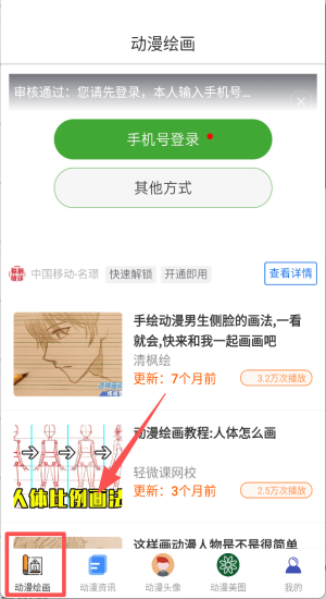 1、点击"动漫绘画"图标,进入绘画学习页面,开始动漫绘画学习。