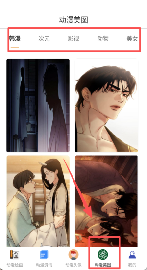 4、点击"动漫美图"图标,浏览各种动漫风格的美图。