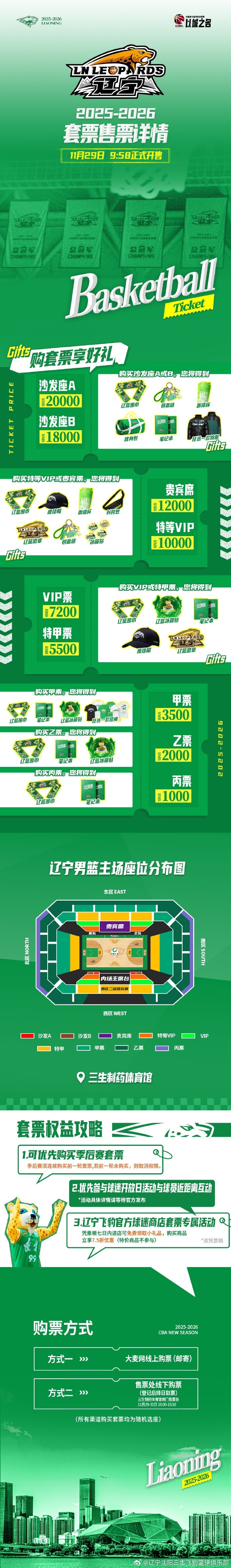 常规赛主场套票将于29日上午9点58分开售。购买本赛季辽宁本钢队主场套票可免费领取不同档次的辽篮周边产品礼包,并有机会优先参与球队训练日活动与球员近距离互动(活动详情及参与方式请留意官方发布)。具体的票价、座位分布、售票方式及主场赛程表详见后附图表。
