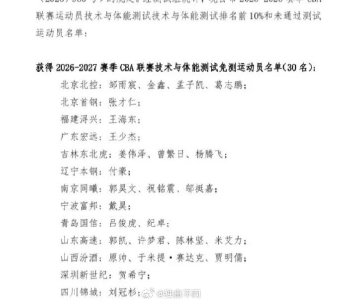 《半岛都市报》记者杜金城在社媒上报道了明年可以免测的球员名单(体测前10%的球员下赛季免测),一共有30人。具体为:
