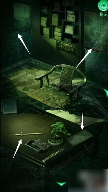 1、进入右边的书房,桌上获得毛笔,书柜左右的两幅字画和桌上的书都有字谜。