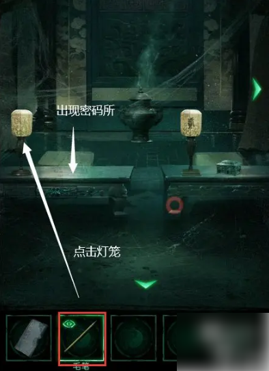 2、通过解开字谜获得“卜、日、印章”,以此打开书柜下的密码锁,看见一把扇子,扇子上有四个字,使用毛笔点击书案上的空白灯笼,桌上出现四字密码锁,根据扇子的文字点击密码,看见一张布防图。