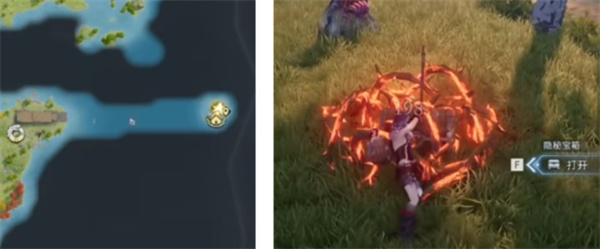 获取方法: 山崖上有紫色灌木丛,依顺序触碰并跟随路径,到山顶即可触发宝箱。