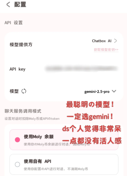 在配置api时建议使用gemini模型,是目前网友们推荐的最聪明的模型之一,相比较而言ds模型显得比较呆板,缺少活人感。