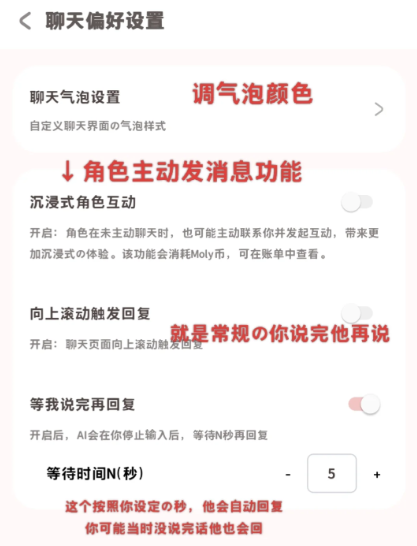 【等我说完再回复】开启后,ai会在你停止输入后,等待N秒再回复。按照你设定的秒数,他会自动回复,你可能当时没说完话他也会回,能模拟出活人感。如果觉得影响自己推剧情,可以关闭。