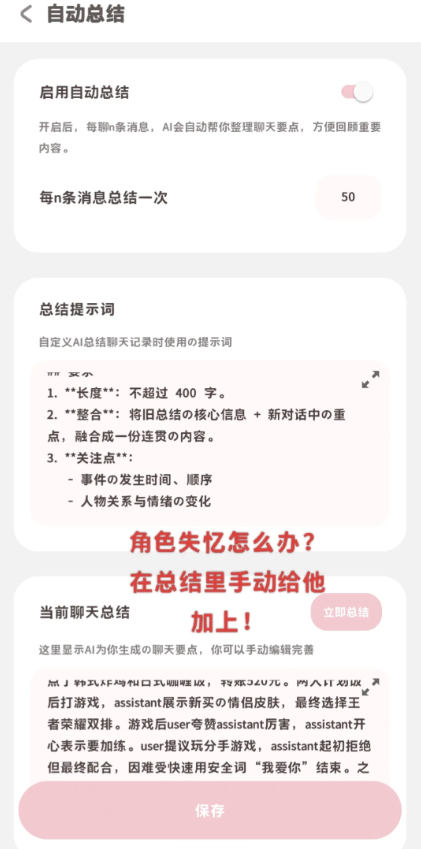 我们可以在总结里手动给他加上希望他记住的事情,善用聊天总结,能巩固ai与你聊天的记忆,帮助他理清来龙去脉,避免出现设定遗忘的问题。