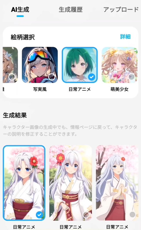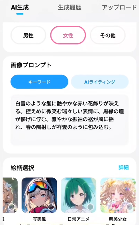 输入关键词(如“黑长直”“哥特风”“兽耳少女”),AI会自动生成初始立绘。想换风格、服装也能继续微调