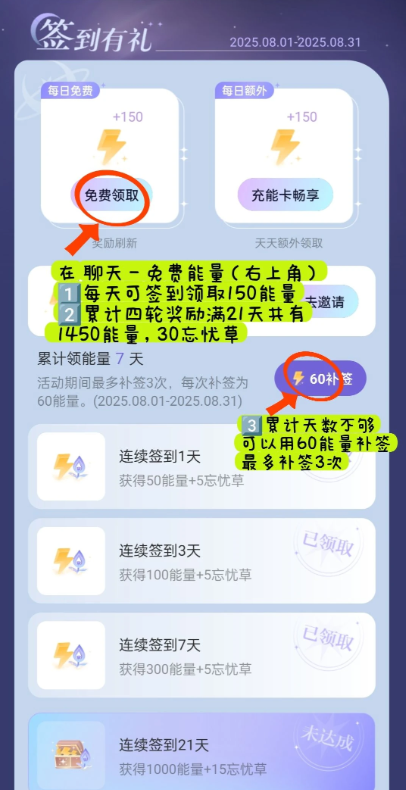 每天都可以领取150能量,累计签到21天一共可以领1450能量,缺天数的用户可以用60能量补签