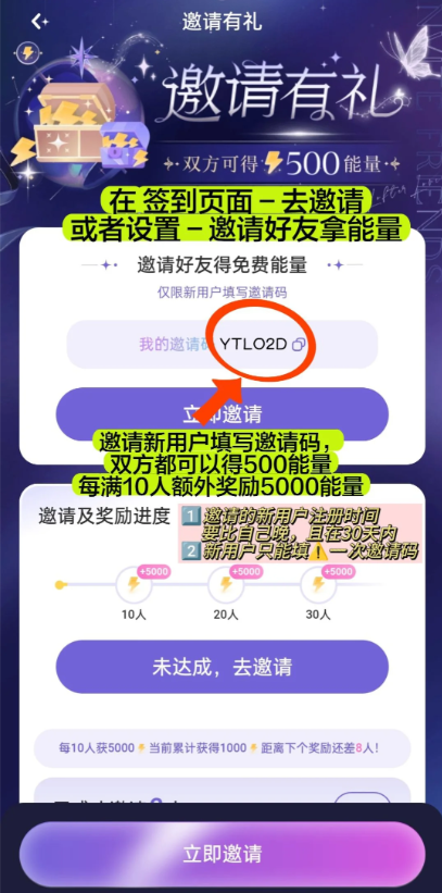 邀请新用户填写自己的邀请码,双方各获得500能量,每满10人额外奖励5000能量