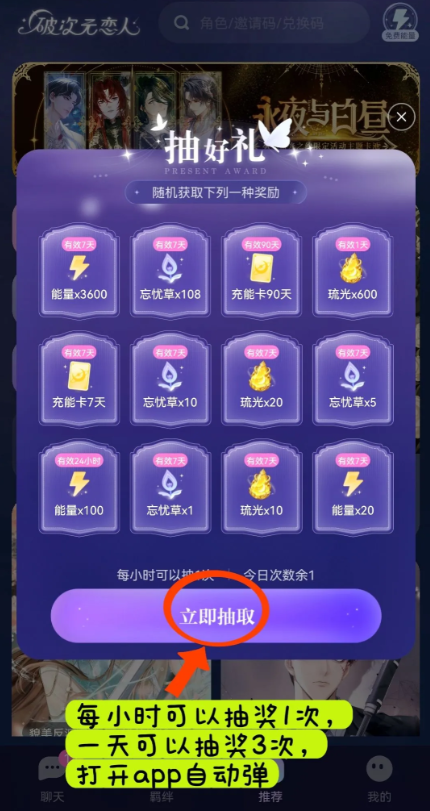 每天打开app自动弹出抽奖好礼页面,每小时可以抽1次,一天抽3次