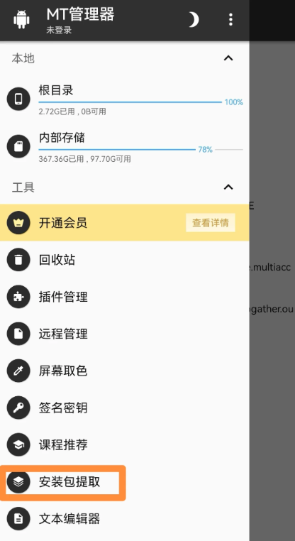1、打开MT管理器点击左上角三条杠形状的图标,在左侧菜单中选择【安装包提取】