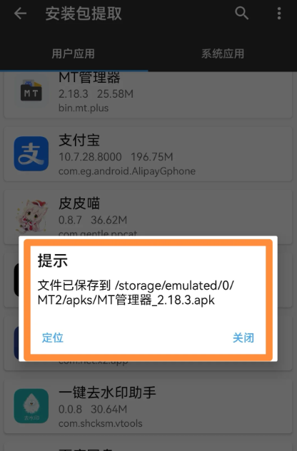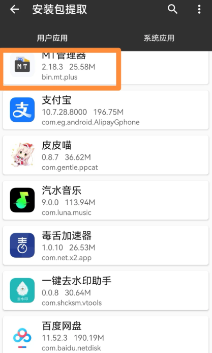 2、【用户应用】是你自己下载的app,【系统应用】是手机自带的app,找到你要提取安装包的app并点击