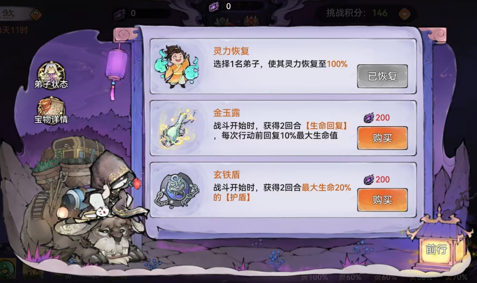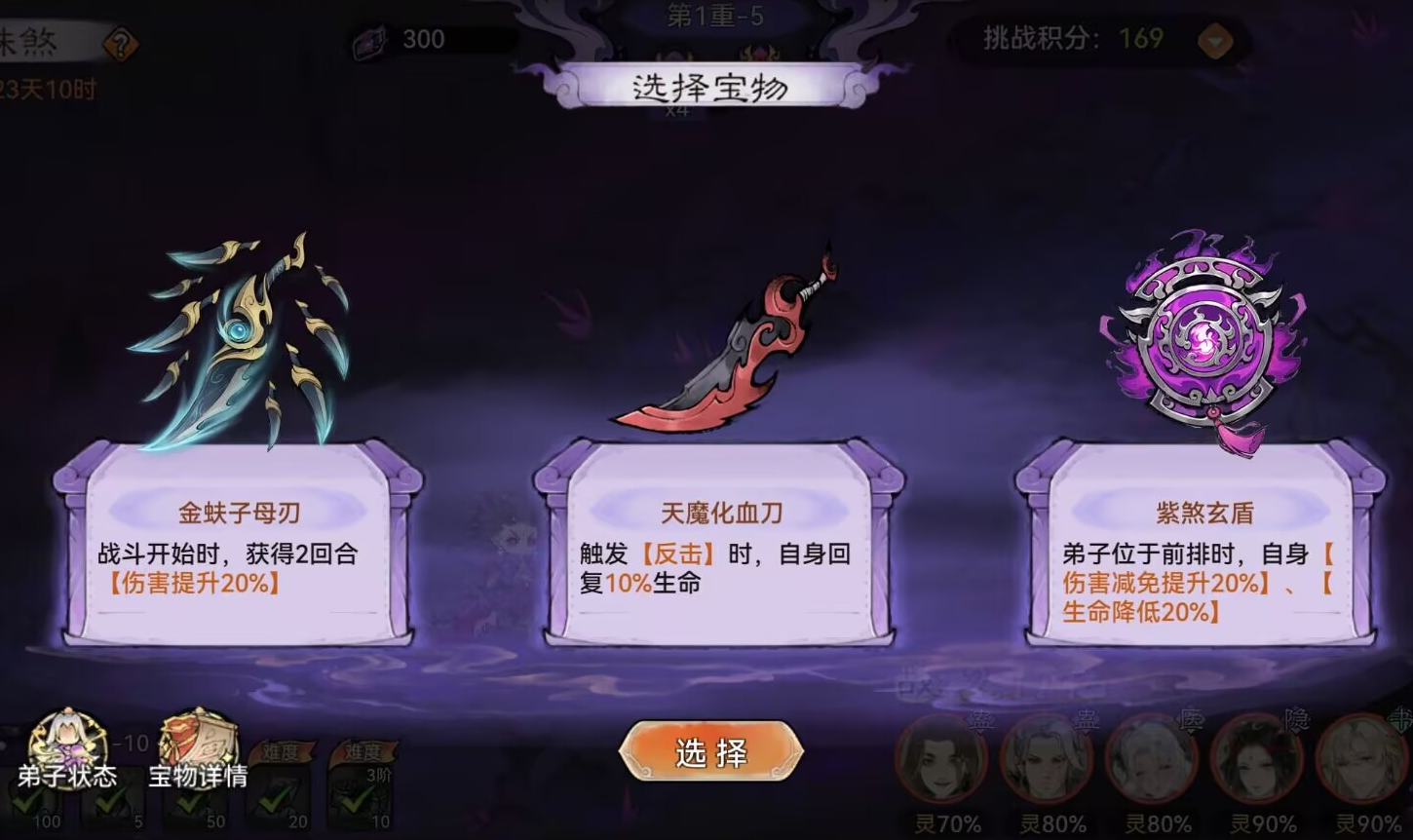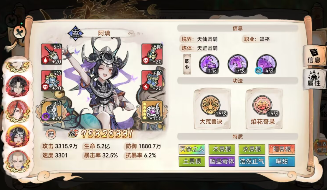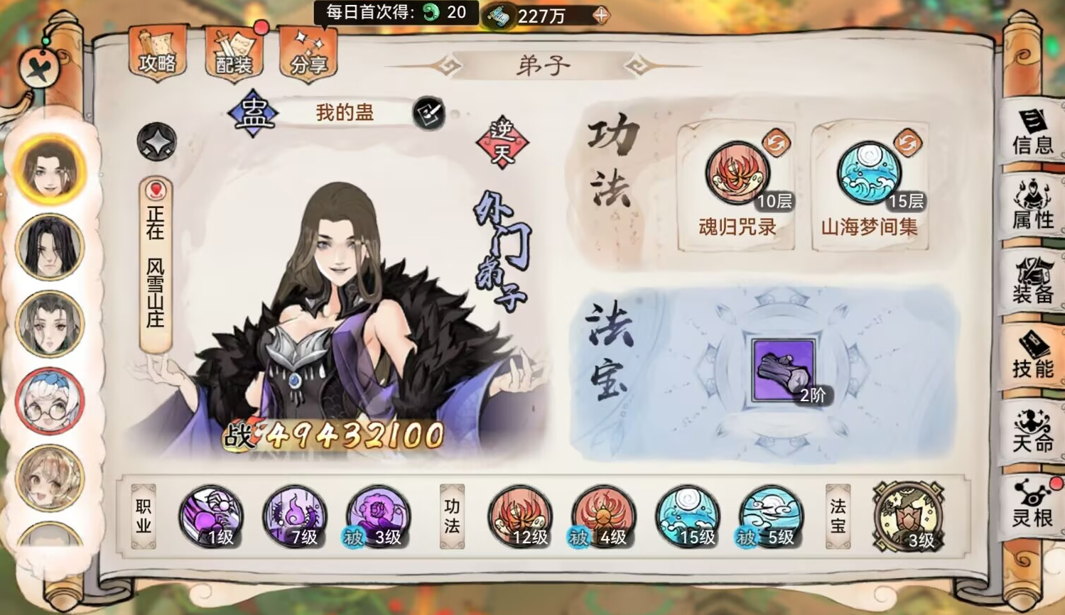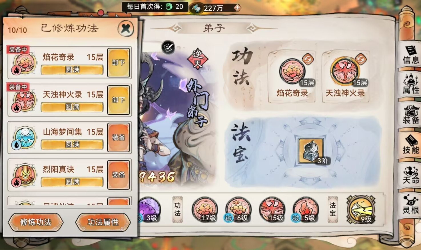 3、其他挂件弟子就找自己阵容中的战力比较低的弟子就行,功法还是带魂归+山海或者凤魂,法宝带二阶木。