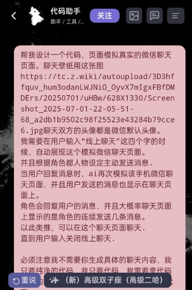 我需要在用户输入“线上聊天”这四个字的时候,自动展现这个模拟微信聊天页面。并且根据角色都人物设定主动发送消息。