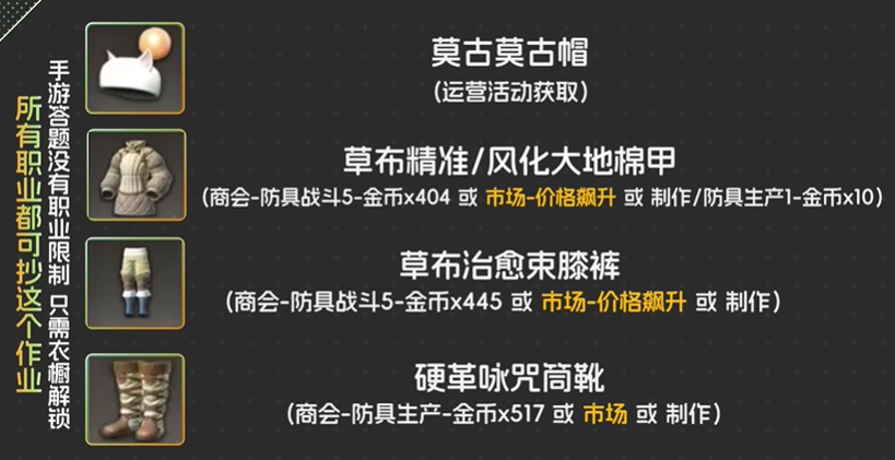 2、身体:草布精准/风化大地棉甲(商会-防具战斗5-金币x404或市场-价格飙升或制作/防具生产1-金币×10)