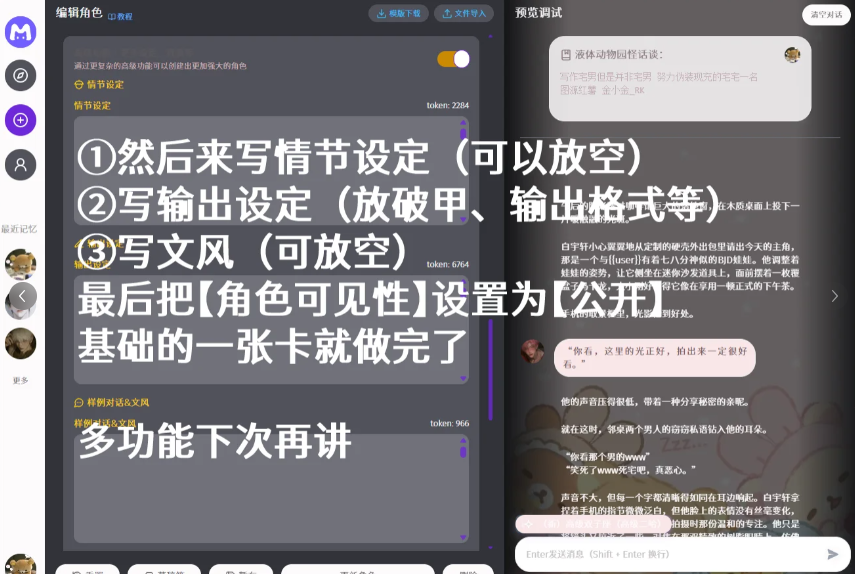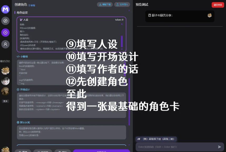 用来放你的角色人设(多人卡就放多个人)以及所有和AI角色扮演相关的指令,比如禁止角色偏执极端等