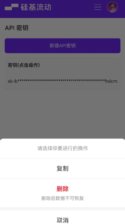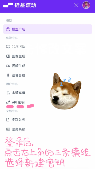 1、登录硅基流动(网址:http://siliconflow.cn/),点击右上角三条横线,选择新建密钥