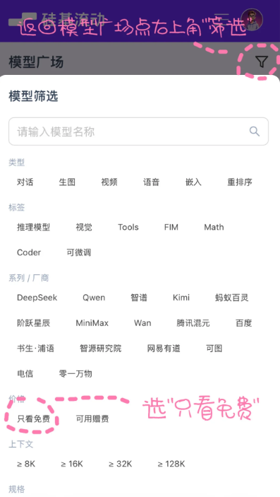 2、返回模型广场,点击右上角筛选按钮,筛选价格【只看免费】