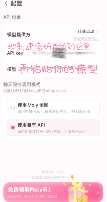 5、在配置的api设置里,把新建密钥复制到这里,再粘贴你的模型就行了