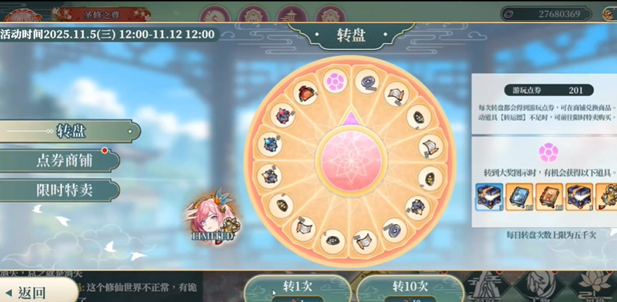 4、转到大奖有概率出右侧5种展示道具之一,不是必定出时装自选箱的