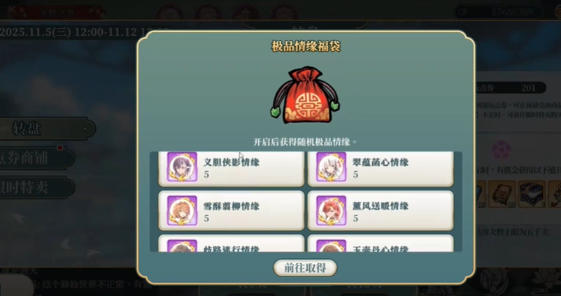 3、转盘里比较有价值的就是极品情缘福袋和大奖了,其他都是一些垃圾素材
