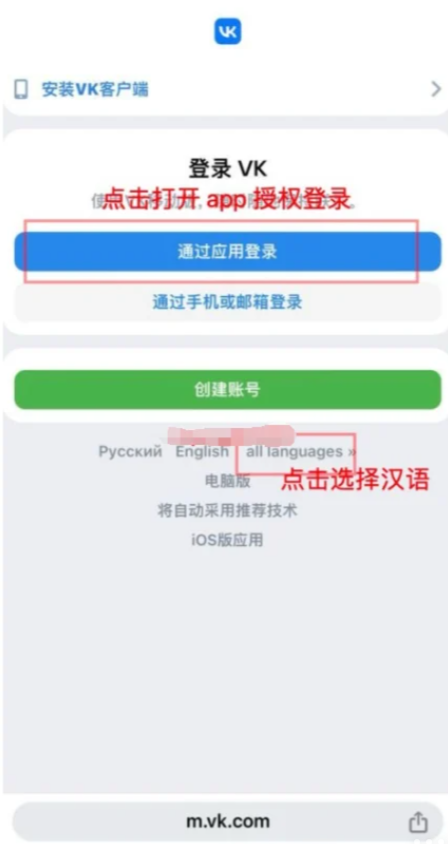 使用手机浏览器打开vk.com,在登录界面下方点击Languages,可以选择汉语
