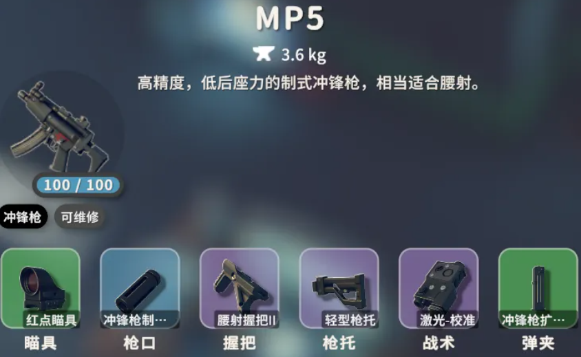MP5不带配件的腰射散布已经很低了,所以将枪托换成轻型枪托加点移速。该套改法也可以将弹夹换成紫色的。