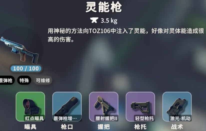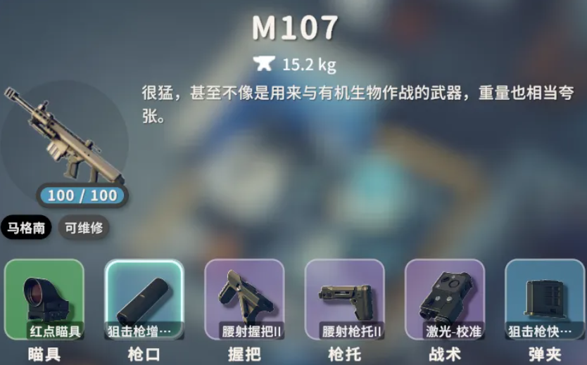 枪口可以换成狙击枪制退器-机动,实现四腰射加成。这把枪重量最重,单发伤害最高。推荐走腰射,在实验室这些地方清理游荡者还是很好用的。