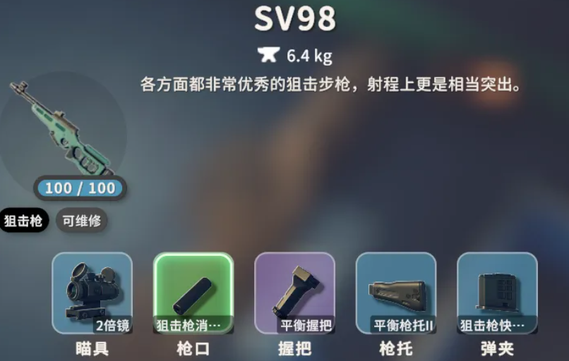 SV98是瞄准流的代表,要是能再上一个战术枪口就更好了。整体来说作为狙击枪还是很不错的,100%爆头,只是需要注意路线上不要有遮挡。