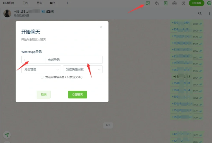 2、打开Whatsapp网页版,右上角有一个放大镜图标,点开添加国家区号、号码就可以给对方发消息了