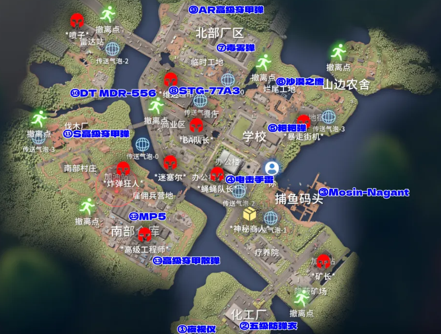 农场镇可以在南部工厂拿到版本最强冲锋枪MP5,还能将大部分子弹提升到高级穿甲,步枪也有黄DT制作配方,到了农场镇也能快速提升战力。这里简单说两个获取稍微麻烦的图纸,其他绝大部分都不会卡,直接按照标点去拿就行。