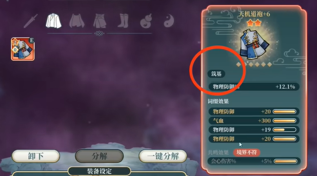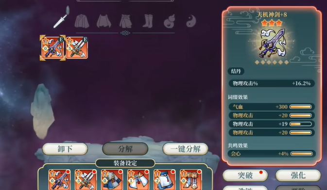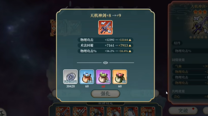 5、红装强化和突破都拉满后,可以点击晋阶消耗天机点对装备进行进阶。进阶后会提升装备的阶级(入门、练气、筑基、结丹、元婴、化神),当装备的阶级与主角的修为匹配时,会激活装备的共鸣效果提供特殊加成