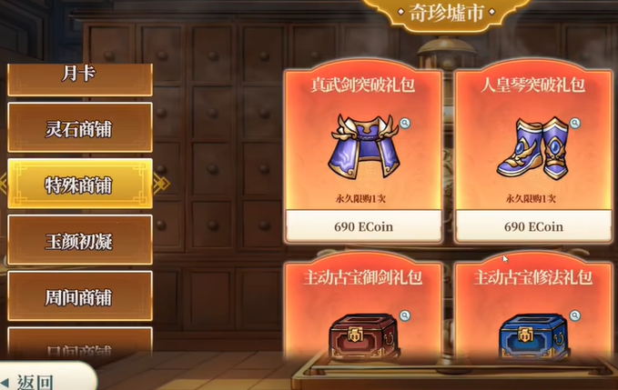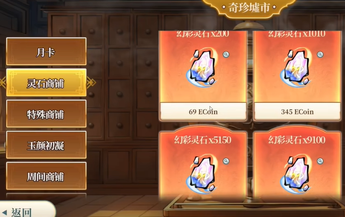 2、在奇珍墟市中消费Ecoin可获得天机点,推荐Ecoin买月卡、周卡、幻彩灵石