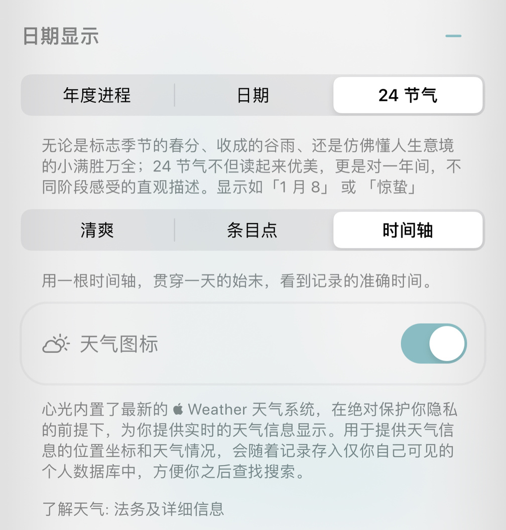 「年度进程」如104/365;「24节气」如「惊蛰」