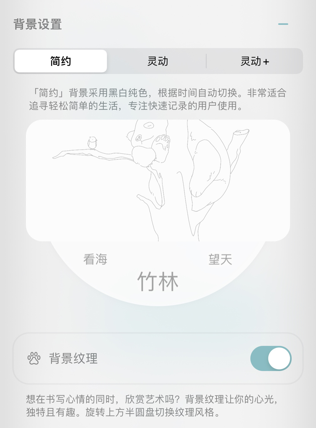 ①背景纹理:有「看海」、「竹林」、「望天」三种精美纹理
