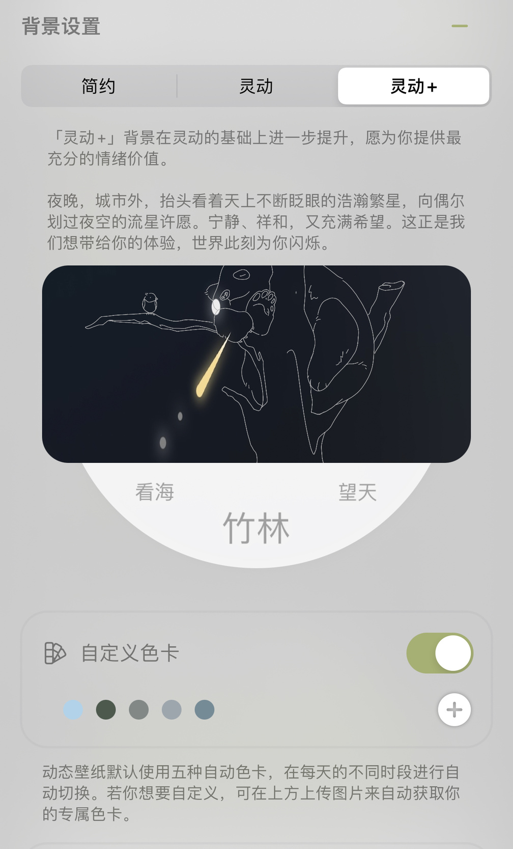 简约(纯色)、灵动+模式(动态壁纸,可自定义色卡)