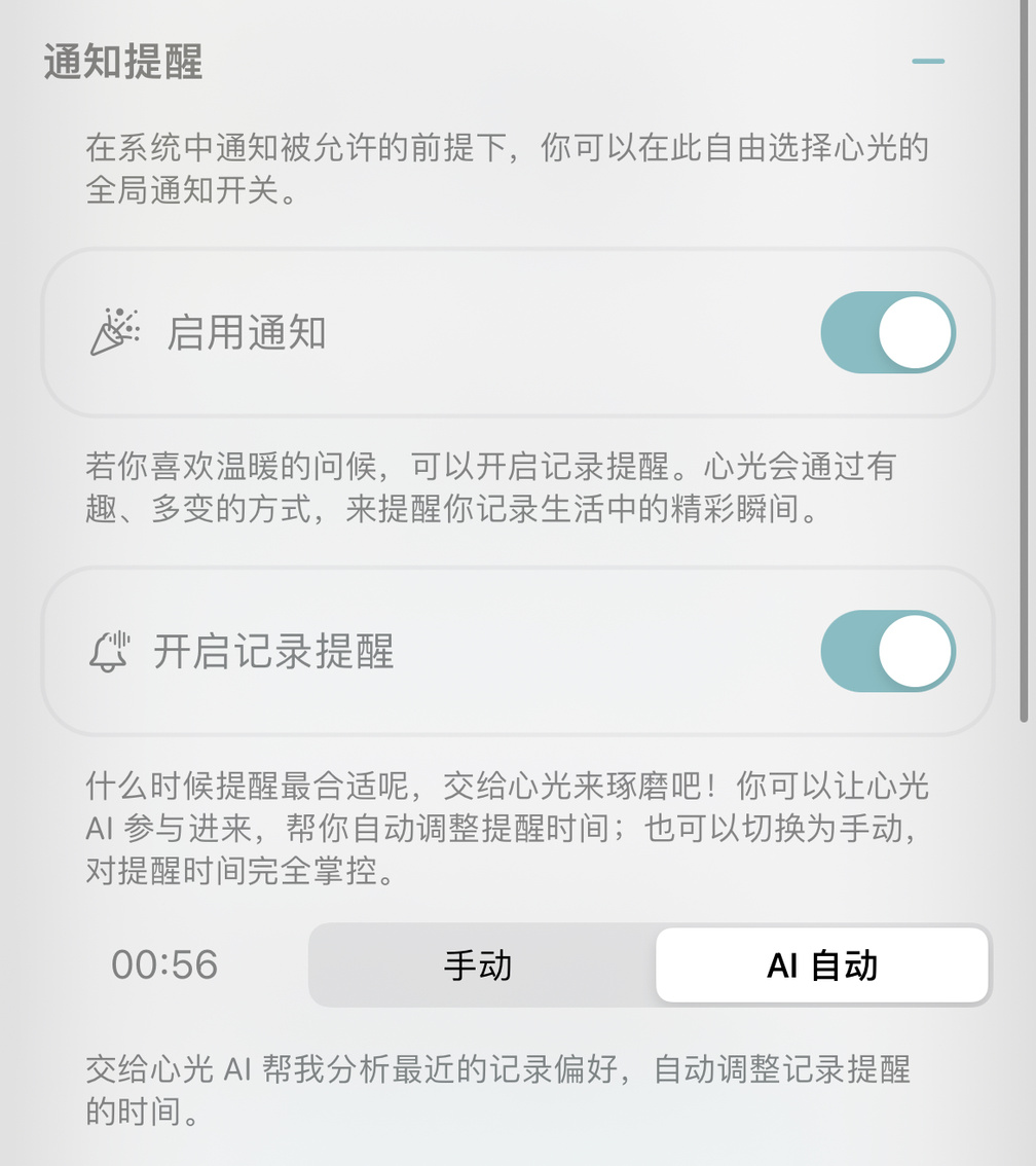 全局通知开关。可以手动设置提醒时间,也可以交给 AI 自动