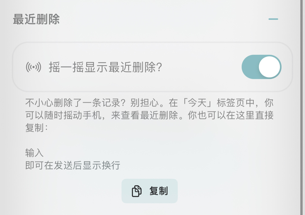 在「最近删除」中,可以复制回不小心删除的条目。还可以设置摇一摇开关