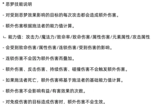 1、恶梦技能对受到恶梦效果影响的目标每次攻击造成额外伤害,额外伤害能根据施法者能力计算