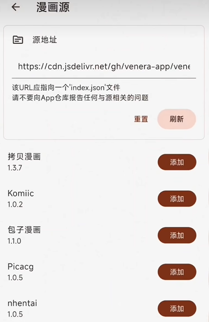 4、刷新出来后有很多漫画源,选择想看的漫画源点击添加